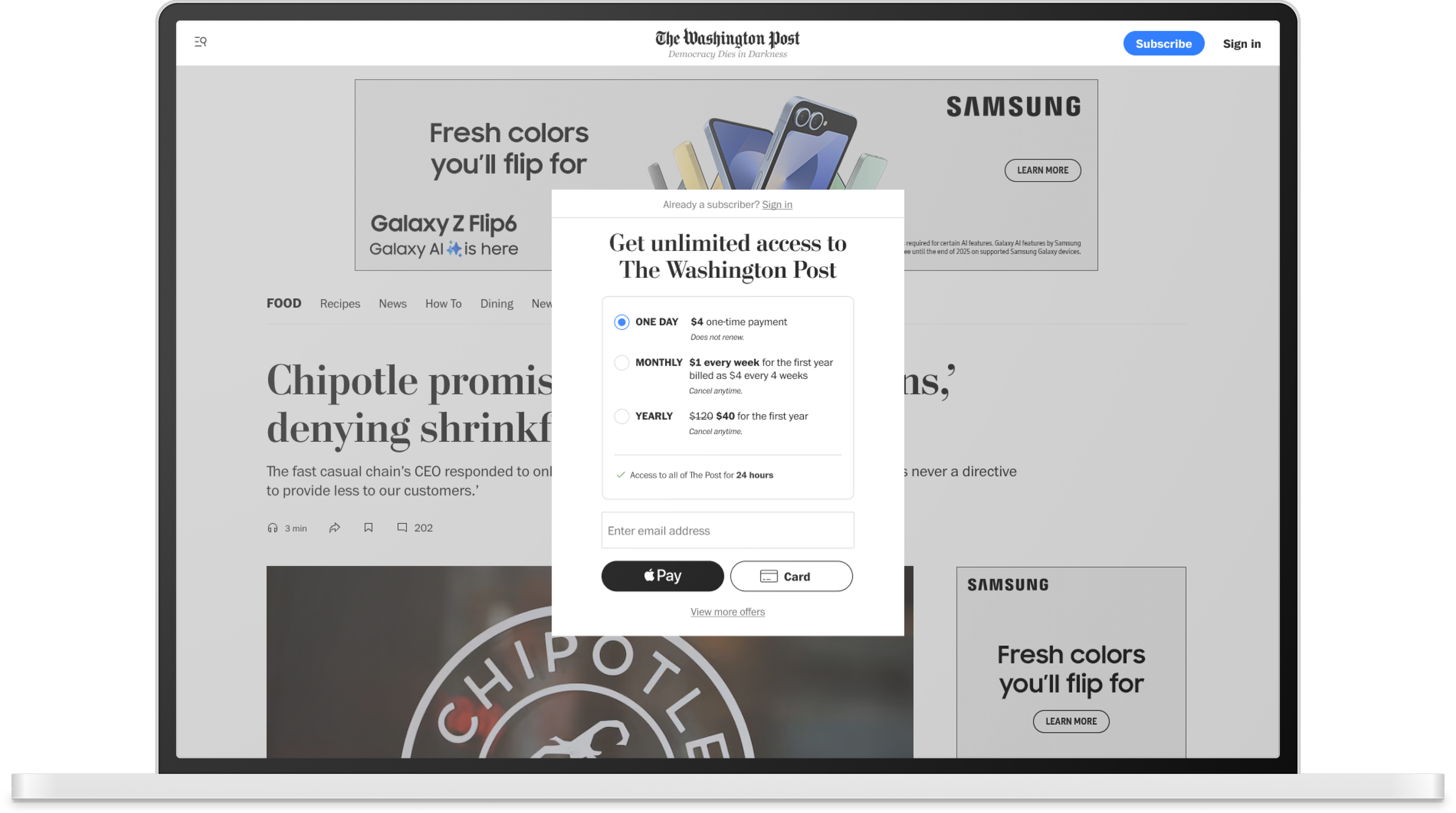 Day and week passes allow these subscription-averse readers to get access to The Post when they need it, without the long-term commitment. We’re asking them to date us—not marry us. And from a business standpoint, we can open up a new revenue stream for previously untapped audiences.
